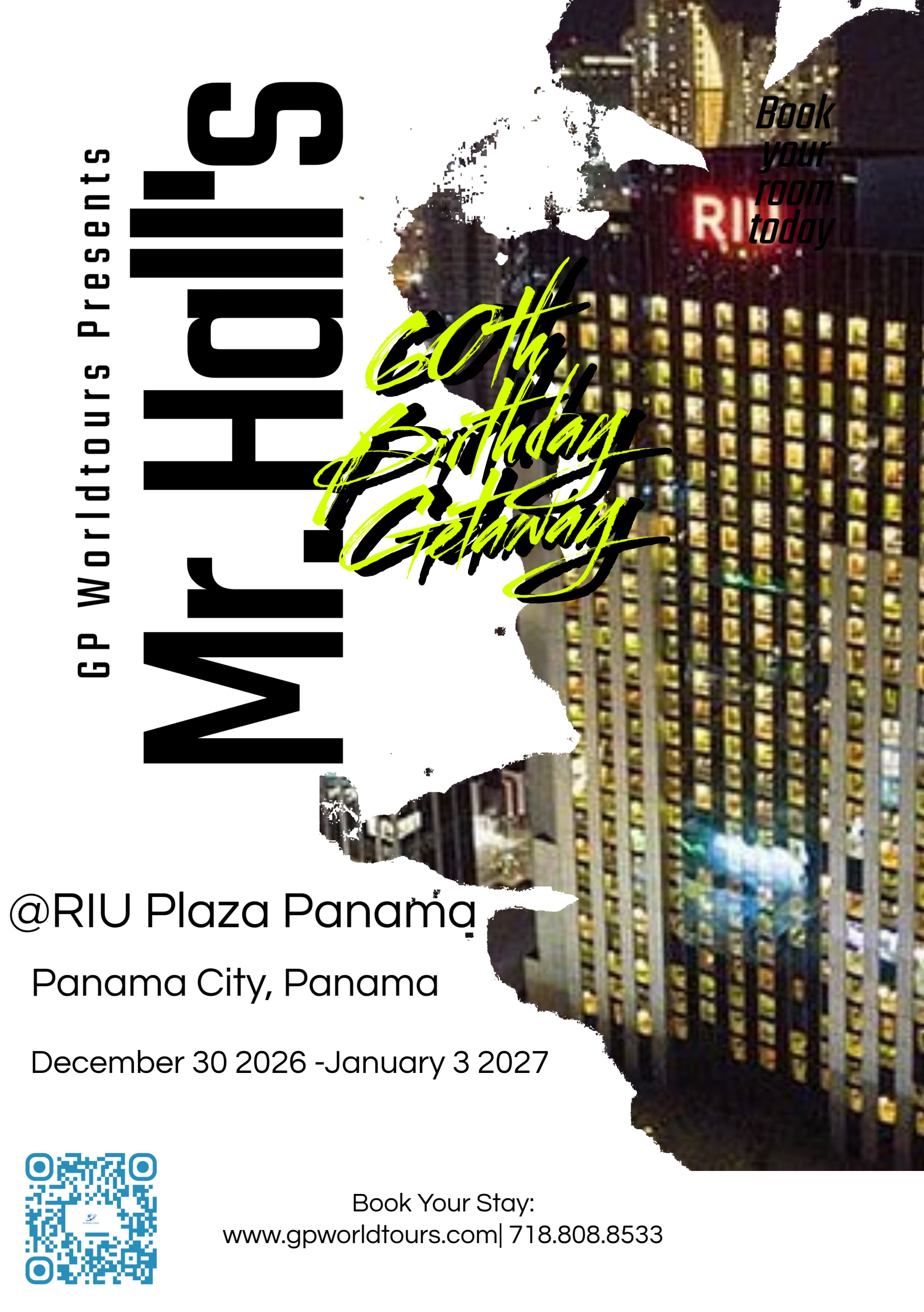 Mr. Hall's 60th Birthday Panama Getaway! Join us @Riu Plaza, Panama City, Panama from December 30, 2026 – January 3, 2026. Book your stay now at www.gpworldtours.com or call 718-808-8533.